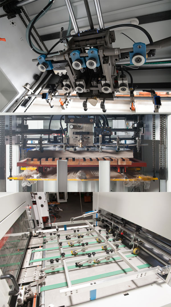 Европейската техника Прецизно захранващо устройство, приляга на хартиения и гофрирана хартия.4 Изпращане на смучене 4, може да регулира ъгъла и височината на смукателната дюза според изкривяването на хартията. Двойна странична полагане (издърпване и натискане). Захранване на устройството Фина настройка, нон-стоп регулиране. Електронен двоен детектор. Основно, вторично захранващо устройство NO-Stop превключвател. Износещо колело за пресоване на PU. Товарач с двойна цел. Устройство за хранене на времето за хранене. Допълнителен комплект за карета 1, карета